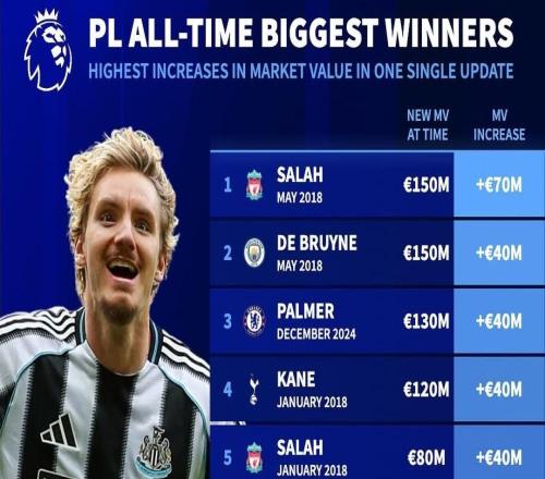 英超历史单次身价涨幅榜:沃尔特马德3500万欧位列第6
