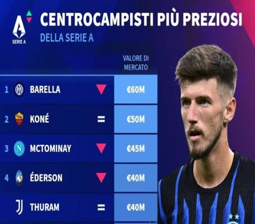 北京时间12月27日,德转列出了球员身价更新之后,意甲中场身价TOP10,巴雷拉6000万欧元排名第一,夸迪奥-科内5000万...