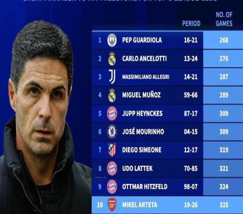北京时间1月31日,德转列出了执教单一欧洲五大联赛俱乐部达成过200胜里程碑的主教练,阿尔特塔以325战取胜200场...