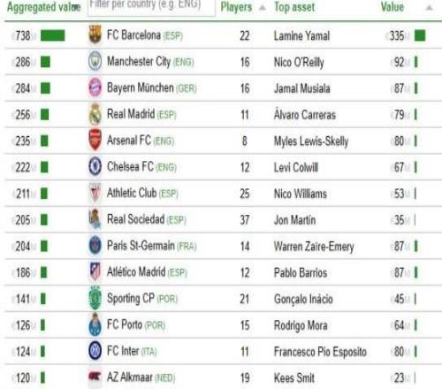 CIES青训球员身价榜:巴萨7.38亿欧断层领先,曼城2.84亿第二