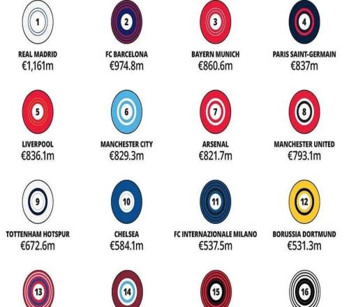 2026全球收入最高的30大足球俱乐部,皇家马德里、巴塞罗那、拜仁慕尼黑排名前三