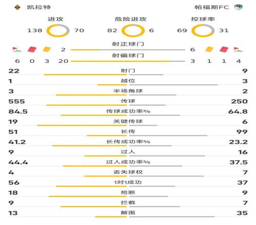 雷速体育10月22报道 25/26赛季欧冠联赛第3轮,凯拉特0-0互交白卷闷平帕福斯FC。开场仅4分钟,科里亚便因为严重犯规被直红罚下,帕福斯只得以10人应战。下半场比赛,凯拉特门将阿纳别科夫曾打入一粒乌龙,但因帕福斯球员越位在先进球无效,最终两队0-0闷平各拿一分。