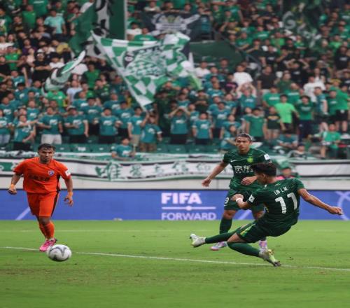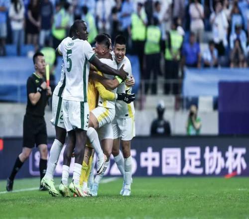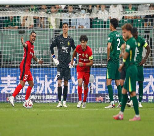 ↑8月20日,北京国安队球员林良铭(右)在足协杯半决赛中射门得分。新华社记者 胡星宇 摄