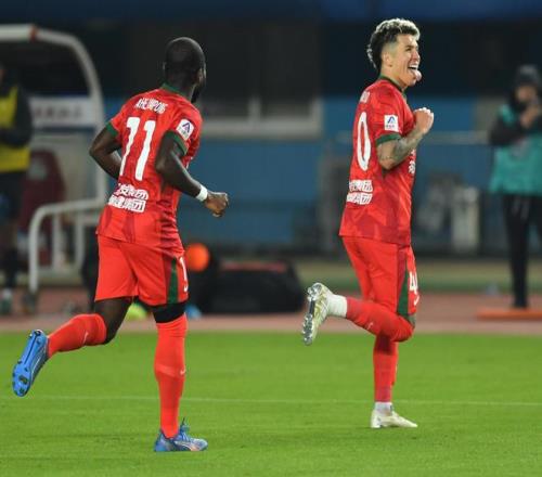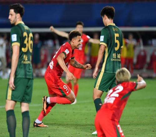 ↑6月22日,河南队球员费利佩·卡多索(中)在比赛中庆祝进球。新华社记者 李嘉南 摄