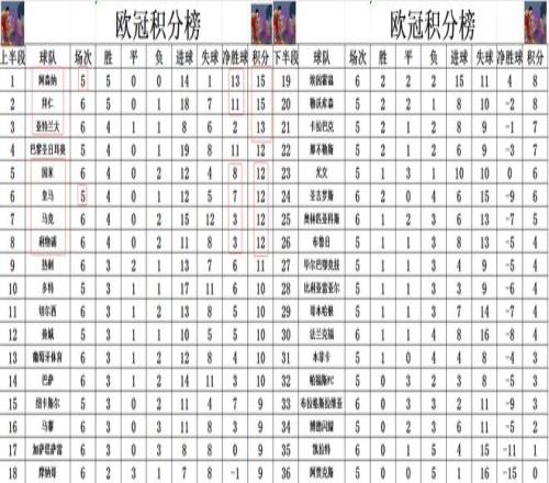 积分榜方面,拜仁逆转绝杀赢球后暂时追上阿森纳,2个净胜球之差位列第2,阿森纳继续领跑。国米被利物浦绝杀遭遇2连败,下滑到第5,亚特兰大则是暂时超过皇马,巴黎,升至第3。利物浦绝杀国米后,超过切尔西,曼城,多特冲进前8。巴萨小胜止住颓势,但是他们还无力进前8,净胜球劣势排在曼城,葡萄牙体育之后位列第14。
